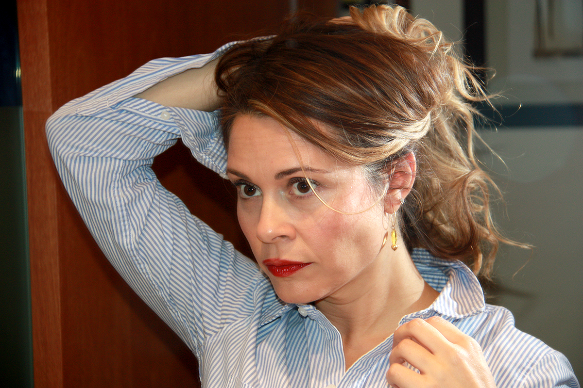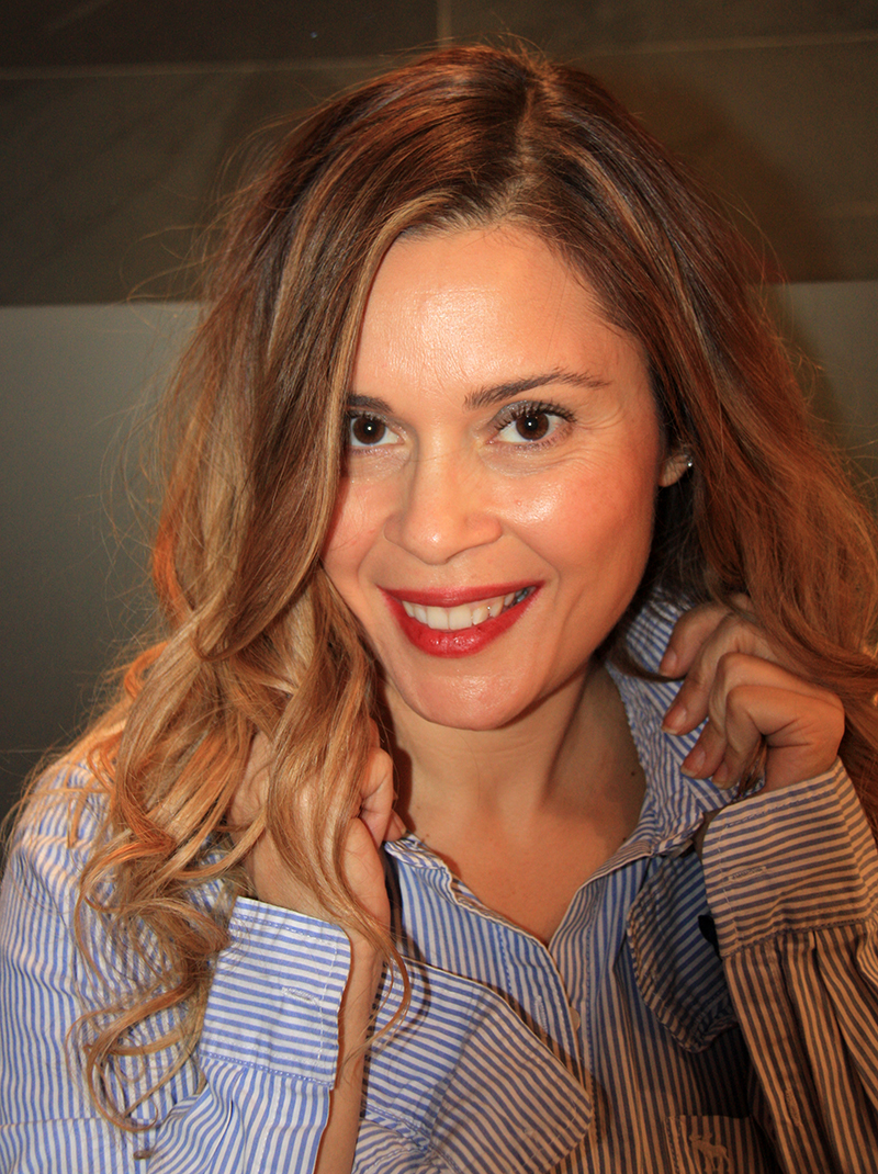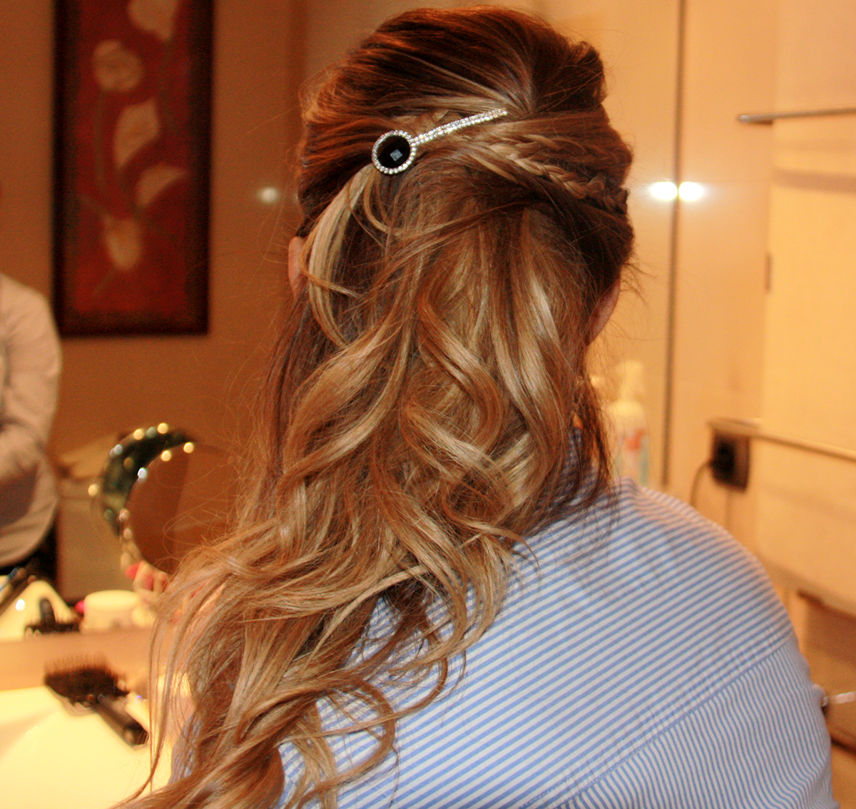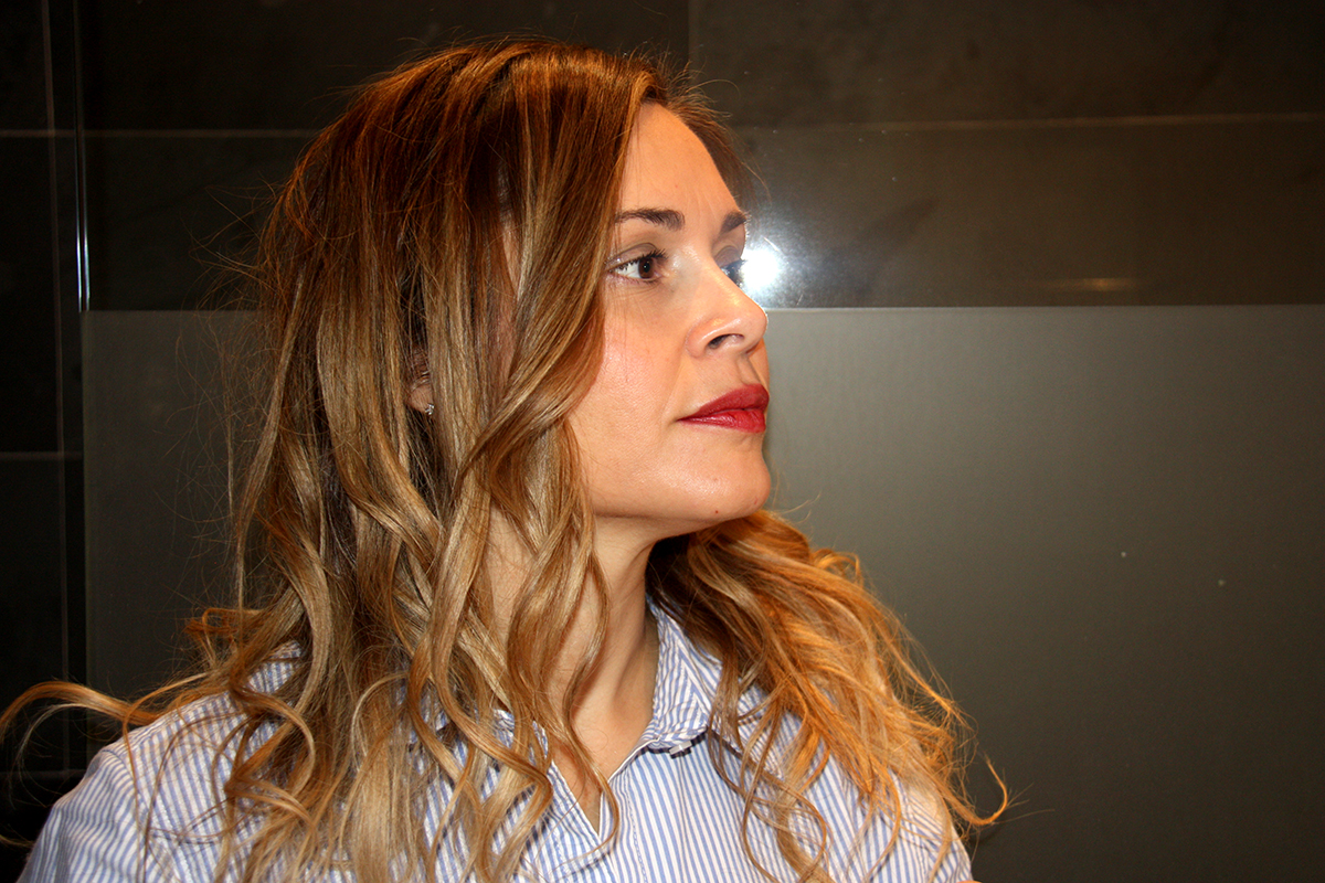 Suelto, secado muy natural, boca a bajo para dar volumen. Repasamos con la plancha, es decir me hago unas ondas en la parte media puntas y voila